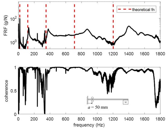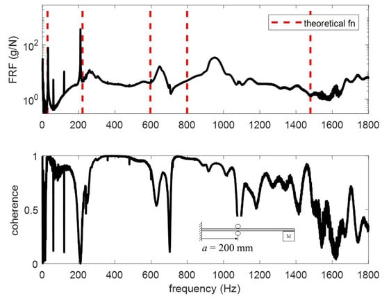 The accelerometers are single axis PCB 353B17. They are connected to a NI-9234 IEPE analog input module seated in an NI cDAQ-9172 chassis. A PCB 086C01 modal hammer with a white ABS plastic tip is used to excite the beam at 300 mm. Five tests under each condition are conducted and averaged in the frequency domain to generate frequency response functions (FRFs) using the algorithm [15]. The FRFs for the different tests are plotted in Figure 12, Figure 13, Figure 14 and Figure 15. The vertical red dashed lines represent the theoretical modes computed from the proposed model. To better understand the differences, the modes are extracted and tabulated in Table 5, Table 6, Table 7 and Table 8.