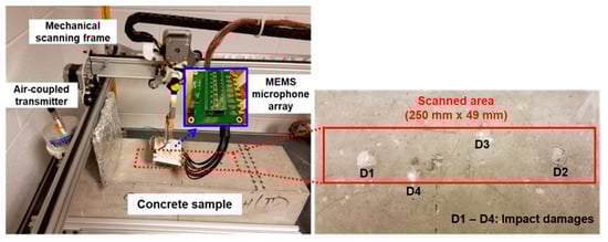 Air-coupled ultrasonic transducers, on the other hand, do not require special surface treatment and can serve an alternative solution to perform contactless measurements needed for ultrasonic wavefield imaging [,]. However, the spatial resolution of the acquired ultrasonic wavefield data can be undesirably low if the active sensing area of the air-coupled transducer is not small enough. Recently, the authors developed low-cost contactless ultrasonic wavefield imaging hardware based on a multi-channel MEMS ultrasonic microphone array especially for concrete testing applications [,]. Those results demonstrated that the developed wavefield imaging hardware enables rapid collection of high SNR ultrasonic wavefield data from concrete elements.