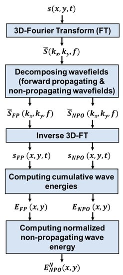 An overview of the f-k domain wavefield data processing approach is shown in Figure 2. The data processing approach described in this section generally follows the data processing procedure that we proposed in []. However, the dimension of the forward and inverse Fourier transforms (FT) carried out in the process is increased by one to consider a 3-D data structure of the collected wavefield data: one dimension in time t and two more dimensions in space x, y.