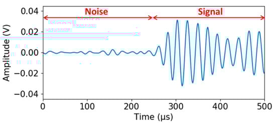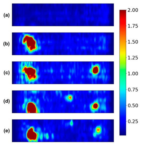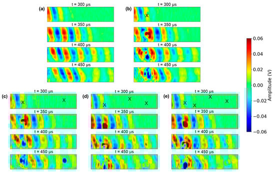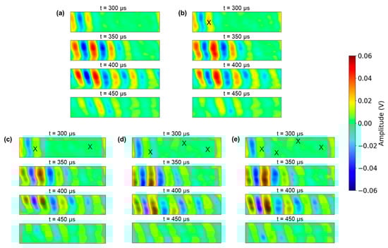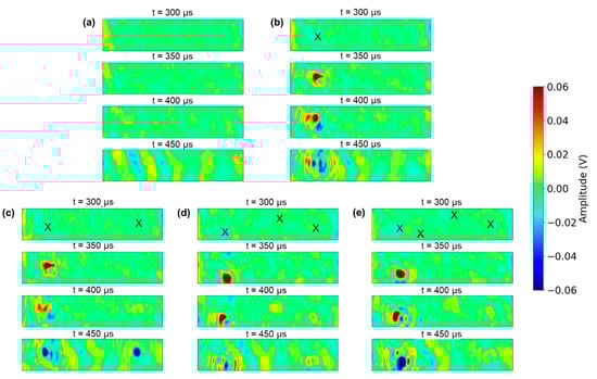 An example time domain ultrasonic surface wave signal collected from the pristine concrete sample case is shown in Figure 3, which reveals suitably high signal-to-noise level. Measured ultrasonic time-space domain surface wave data for all the sample cases are shown in Figure 4. The total time required to acquire each wavefield data set was 5.6 min when using the following data acquisition parameters: 25 time averages per signal and an 80 ms pulse repetition interval. Although not presented nor discussed in this paper, the wavefield data acquisition time can be significantly reduced using a compressed sensing approach [,]. Wavefield snapshots at four time instances are shown for each wavefield data set, and the wavefield images each represent a 250 mm × 49 mm scan area. The locations of impact damage points are indicated as markers (‘X’) within the scan area for each sample case. In the figure, propagation of incident surface waves and scattered wavefields nearby impact damage locations are seen. In Case 0 (pristine concrete) seen in Figure 4a, forward propagating surface waves are the dominant wave components. Cases 1 to 4, seen in Figure 4b–e, show disruption to the forward propagating wavefield nearby the impact damage locations.