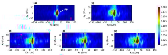 To better understand the scattered wavefields set up by impact damage, f-k domain signal analyses were carried out. The 3-D FTs of the ultrasonic wavefield data sets were computed using Equation (1). The f-k domain magnitude spectrum for each sample case was then normalized with respect to its maximum spectral magnitude. Figure 5 shows normalized f-kx-ky magnitude spectra for the wavefield data seen in Figure 4, where kx and ky are wavenumbers in horizontal and vertical directions, respectively. For visualization purposes, only spectra at the center frequency of excitation (43 kHz) are shown. The pristine concrete sample case (Case 0) seen in Figure 5a, mostly shows forward propagating surface wave components (indicated as ‘FP’) on the positive kx side. The damaged concrete samples cases (Cases 1 to 4 seen in Figure 5b–e) exhibit broadened magnitude spectra, with higher spectral energy outside the major (forward propagating) wavenumber band than for the pristine concrete case. The ultrasonic wavefield data and the corresponding f-k magnitude spectra demonstrate that impact damage in concrete sets up wavefields that exhibit wavenumber broadening. We presume that the wavenumber broadening is caused by surface wave scatter set up by the cracked damaged regions in the concrete.