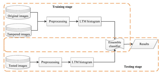 A passive detection method is presented for image resizing forgery detection in this paper. Figure 3 shows the implementation process diagram of our presented algorithm. Similar to the process of most existing forensics methods, our proposed method consists of two parts, i.e., a training part and a testing part. In the training process, tampered images and their corresponding original images are adopted as data sets. First, all the training images are preprocessed. Second, the LTM histogram features are extracted from preprocessed images. Finally, a training model is obtained by using ensemble learning based on extracted features. In the testing process, the LTM histogram features are extracted according to the same steps in the training part. Finally, the extracted features are used by the trained ensemble classifier to distinguish which resizing method a tested image is re-targeted.