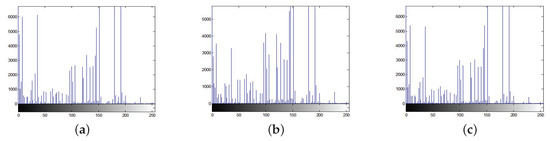The histogram features of LTM: (a–c) corresponds to the LTM histogram of Figure 4d–f, respectively.