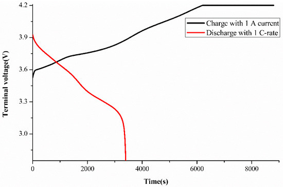Eight batteries were divided into 4 groups consisting of 2 batteries each, and each group had a difference of 50 cycles of charging–discharging. We implemented this process to observe the effect of varying cycle number on the performance of the batteries. In this experiment, we used the Constant current-Constant Voltage (CC-CV) method to charge the batteries. 1 A constant current (as recommended from the battery’s datasheet) was used to charge the batteries to its cut-off voltage, then the charging was done with a constant voltage until the current dropped to 100 mA. When the battery was fully charged, we implemented 1 C-rate (typical capacity = 2.15 Ah) to discharge the batteries until the cut-off voltage of 2.75 V was reached. Figure 1 shows a typical terminal voltage curve during charge and discharge of the batteries used in this work. The initial discharge voltage was around 3.9 V instead of 4.2 V due to the voltage drop caused by battery internal resistance [23] when the voltage drops to 2.75 V that means the end of discharge operation.