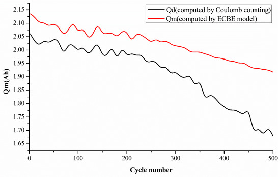 To further validate our ECBE model results, we have also added the Coulomb counting result in Figure 4. However, it was mentioned in the introduction that there are many disadvantages to employing the Coulomb counting method, as mentioned by researchers. Coulomb counting employs an open-loop estimator, which generates larger cumulative errors. It also does not take a change in the battery’s capacity into account as the battery ages [30]. Other disadvantages of the open-loop are its sensitivity to the current sensor precision and uncertainty of initial SoC [31]. It also shows an increase in charge at certain cycles, as observed during the ECBE charge estimation results. The higher value of Qm over Qd is expected, as explained in Leng et al.’s work [15]. A very interesting point is observed from Figure 4 regarding the charge increase at various aging cycles. This is an unusual phenomenon observed in our results, and we would like to investigate it further by performing a charge cycle-dependent test for batteries. This will be our future work, and we would hope to share our findings from our test with the scientific community very soon.