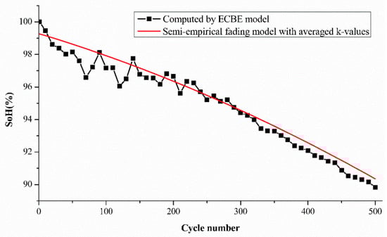 After verifying the ability of the semi-empirical fading model of a LiB cell, we examined the ability of the extracted k values to estimate the SoH of other cells from the same batch. To verify this, average, k values obtained in our previous steps were calculated, as shown in Table 4, and they were used to estimate the SoH of the batteries over the number of cycles tested.