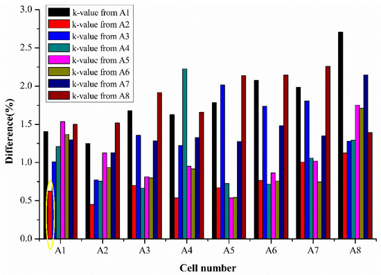 Figure 8 shows the results of the percentage difference for SoH estimation when k values from one cell are used for various cell’s SoH estimation tested from the same batch. The various colors represent the cell number whose k values are used for SoH estimation in Figure 8. For example, the bar represented in the yellow circle represents the difference percentage of cell 1 when its SoH is estimated using the k values extracted from cell 2.