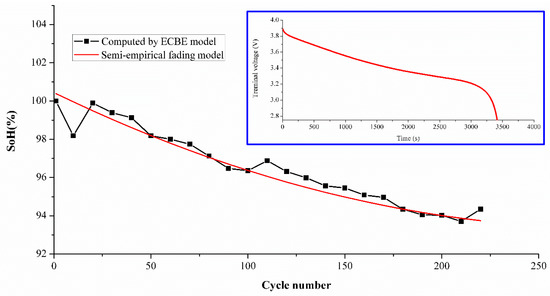 To demonstrate the effectiveness of the model for other types of batteries, a simplified model was used to estimate SoH for two Lithium Cobalt Oxide (LCO) batteries tested for 220 cycles under ambient conditions similar to the experimental set up shown previously for NMC batteries. The LCO sample used in this experiment was a MOLICEL ICR-18650M (MOLICEL®, Taipei, Taiwan) with a typical capacity of 2.8 Ah [32], and its electrodes were composed of LiCoO2 and a graphite anode. The charging current set in the experiment was 1 A, and discharge was 1 C-rate (= 2.8 A). Due to the limitation of time and instruments, only two samples were tested as the purpose was simply to demonstrate its effectiveness in principle. The estimation difference is shown in Table 7, and the average differences are 1.77% and 1.03%, respectively. The difference is found to be less than 2 percent. The SoH comparison between the ECBE and semi-empirical model is shown in Figure 9, which includes the discharge curve of the LCO battery as an inset.