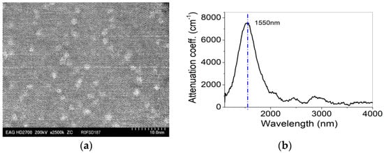 (a) A TEM image of ErAs quantum dots. The image was taken by an EAG Laboratory in Raleigh, NC, USA. (b) Attenuation spectrum of GaAs: ErAs sample.