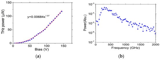Figure 3a plots the average THz power vs. bias voltage at an incident 1550 fiber laser power of 65 mW. A maximum THz power of ~117 μW was measured with a cross-calibrated Golay cell detector at room temperature []. The curve in Figure 3a is good fit by a power law: PTHz α V1.97. Figure 3b displays the power spectrum from the FFT of the interferogram obtained with a Michelson autocorrelator. It displays a maximum spectral density around 250 GHz.