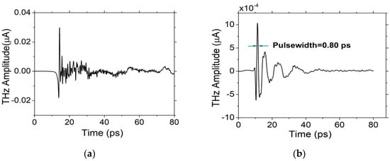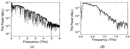THz generation using InAs QD arrays distributed in GaAs has been reported previously [,,,]. The maximum THz power output was ~0.9 µW for pulsed InAs-QD emitters when pumped with 50 mW 800 nm laser power, and ~0.15 nW for InAs-QD photomixers when pumped with 30 mW 1200 nm laser power. While the pulsed emission has a much better conversion efficiency (~1.8 × 10−3%) than the photomixing (~5 × 10−7%), no ringing was observed in its time-domain profile. The working mechanism was attributed to reduction of the photocarrier recombination time by an Auger-related process [], not the superradiance proposed in this research.