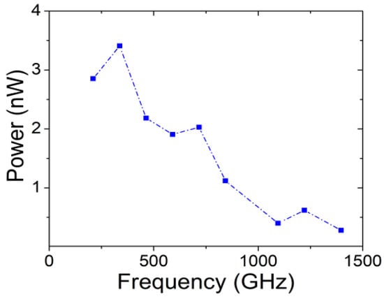 Further support for the superradiance is provided by pulsed vs. cw (photomixing) results. As described above, photomixing measurements were carried out on the same devices (Figure 2) as the pulsed measurements. Although the total 1550 nm power (295 mW) was much higher than in the pulsed experiments, the heavily infrared (IR) filtered maximum average THz power from the photomixing was only ~3.4 nW at 337 GHz as measured with the cross-calibrated Golay cell detector (Figure 6). This corresponds to a conversion efficiency of 1.2 × 10−8. The power dropped continuously as the difference frequency increased but was still detectable up to 1.2 THz, consistent with the THz signal coming from photomixing and not just heating. Thus the broadband pulsed-mode is ~1.5 × 105 more efficient than the narrowband photomixing mode, which is significantly greater than in cross-bandgap-driven (e.g., 780 nm) THz photoconductive devices. Since superradiance is only expected to be significant in 1550 nm pulsed mode (see below), it is the logical discriminator.