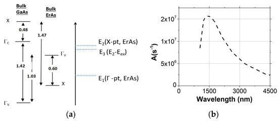 (a) GaAs-ErAs band offsets and the most probable band-to-band transition between a Γ-pt S state (quantum numbers l = 0, n = 1) and a X-pt P state (l = 1, n = 2, m = −1, 0 or 1). (b) Spontaneous emission rate for transition in (a).