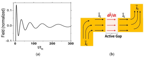 To explain the experimental ringing behavior quantitatively, we applied the sine-Gordon equation, which is an approximation of the famous Maxwell–Bloch set of equation that has been used successfully for description of superradiance of two-energy level systems [,,,]. To solve the sine-Gordon equation for the sample used for Figure 4b, we need just a few parameters. The first one is the total number of QDs under the direct illumination of the pump pulses, which we estimate by N ≈ nQDW2L = 1.62 × 108 where nQD = 1 × 1018 cm−3 is the quantum dot density, W = 9 μm is the gap width (W × W = active area), and L is the quantum-dot layer thickness (2 μm). The instantaneous polarization is the summation over all available dipoles, and P(t) = Np when the dipoles are initially aligned by the strong ultrafast laser field. The initial tipping angle of the Bloch vector P is approximated by θ0 ≈ 1/ = 7.9 × 10−5. Assuming the dipoles radiate coherently, we solved the sine-Gordon equation with this initial value and obtained the “ringing” electric field plotted in Figure 8a. Only two other quantities were required for the solution, the superradiance time constant TR of ≈201 fs, and the individual quantum-dot spontaneous lifetime Tsp ≈ 60 ns. The fact that, TR << Tsp is an essential aspect of superradiant systems. The comparison between experiment and theory, Figure 4b vs. Figure 8a, is good in the ringing behavior beyond the first peak. Namely, the polarization field oscillates about zero, and is damped over about four periods. As a telltale sign of sine-Gordon behavior, the period increases with time as the ringing evolves, which is why the waveform in Figure 8a is a “quasi-sinusoid” rather than a pure sinusoid.