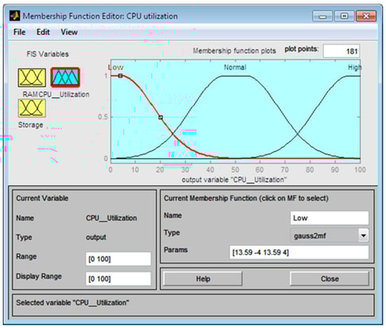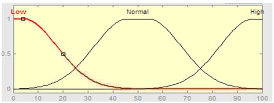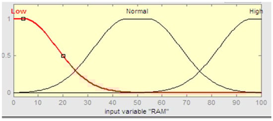 As in principles of the fuzzy theory, sets of values overlap, and thus a value may partially belong to the set and have a membership degree of 0 ≤ µ ≤ 1, which can be any point between zero and one, where µ represents the degree of membership []. Consequently, the value belongs to several sets, and the total membership is added to one. The linguistic descriptors “Low” and “Normal” are two fuzzy sets of CPU variables that can overlap, so a CPU of 20 can be mostly “Low” with μ = 0.7 and somewhat “Normal” with μ = 0.3.