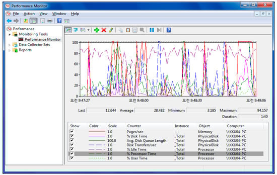 The performance monitor package provides real-time system performance utilities. This program receives performance data from computer components. The performance monitor window allows us to view, in real-time, detailed information about the hardware components (CPU, disk, networks, and memory) and system resources (including descriptors and modules) used by the operating system, services and running applications. In addition, we can use the resource monitor to manage processes, start and stop services, analyze process deadlock, view thread wait chains, and determine the files responsible for the blocking processes. When using the performance monitor, the CPU utilization is displayed in different fields. The “% User Time” shows the CPU utilization that occurred during execution at the application level. This field indicates the time taken to start the virtual processors. The “% Idle Time” indicates the percentage of time during which the CPU or CPUs were in idle mode, and the system did not have a failed request for disk I/O. The “% Processor Time” gives the summation of all the others and hence is the absolute CPU utilization as shown in Figure 4. In the “Memory” section, almost the same information is displayed that can be obtained with the help of the “Task Manager”, but it is ordered in relation to the entire system. The histogram of physical memory displays the current organization of this memory, dividing the entire amount of memory into reserved, used, modified, in standby mode and free. Here “Pages/sec” shows memory utilization. To get disk utilization, monitoring the “Average transfer rate/sec”, “Disk Queue Length”, and “Disk Time (%)” pointers are more efficient pointers.