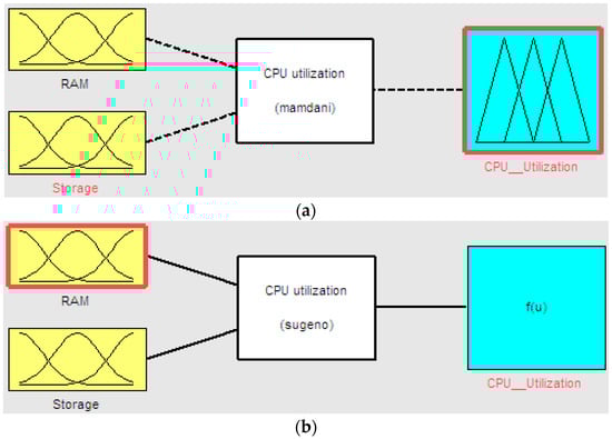 RAM and storage are two input variables. The output variable is the CPU utilization value that is defined by fuzzy logic, as shown in Figure 6. FIS accepts crisp input data, fuzzifies them, uses fuzzy on-premise operators (antecedent), implements inferences from the premise for output (sequential), combines the findings from fuzzy rules for creating a fuzzy inference and defuzzifies it to get a crisp conclusion. The proposed model in this paper is evaluated and tested using the Mamdani and Sugeno FIS.