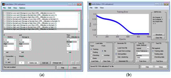 Defining rules for CPU utilization: (a) by rule base for the Mamdani FIS: (b) by training the dataset for the Sugeno FIS.