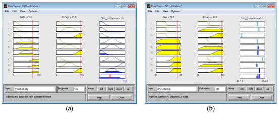 Rule Viewer showing the defuzzified form of parameters: (a) The Mamdani FIS model, the combined result is shown with the red line on the graph, showing the “Middle” status of CPU utilization; (b) The Sugeno FIS model outputs a numerical value.