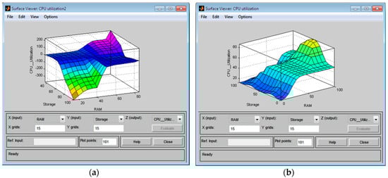 The surface viewer of CPU utilization: (a) The Mamdani FIS model; (b) the Sugeno FIS model.