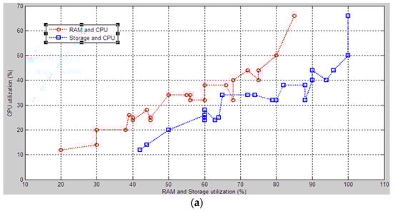 To analyze the results, we made a graphical visualization. Figure 11a shows the effect of the RAM and storage utilization separately to the CPU utilization at the same time. The line with circles represents dependency on RAM utilization and CPU utilization. The line with squares represents storage and CPU dependency. We can see that the line graph shows that CPU utilization is increased accordingly by increasing RAM and storage utilization, i.e., utilization of these two objects increases or decreases CPU activity. In addition, the graph shows that RAM utilization more significantly affects it compared to storage utilization. Figure 11b presents twenty-four cases of the combined influence of RAM and storage on CPU utilization. The meaning of this graph is the same as analyzing Figure 11a. The graph shows that, in the tested computer, the regularity, influence, and congruence between the hardware components are linear and each component is compatible with each other. The compatibility of the system means that there is no necessity for computer designing, and configuration enhancement []; that is, the system is managing with the given workload.