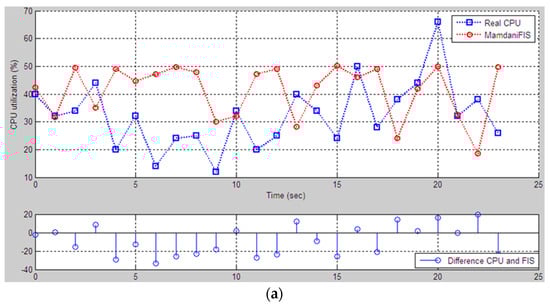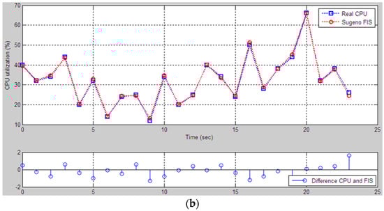 The models’ evaluation results, considering the influence of each factor and its index in the evaluation of the CPU utilization, are not the same. Figure 12 shows the CPU utilization graph for the output of the Mamdani FIS and Sugeno FIS. Figure 12a shows a comparison of the Mamdani FIS with CPU utilization, which is monitored through performance monitoring. The comparison shows that there are some unsuited cases with evaluation, but the results are close to each other. At the bottom of the figure, we show the difference between the real data and the Mamdani FIS result. The Sugeno FIS model shows excellent results, i.e., the model evaluation values are almost the same as the monitoring data (Figure 12b). The training of the inference engine was performed, rather than the rule base inference engine.