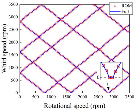 To validate the accuracy and efficiency of the ROM technique, the ROM and full FEM are used to solve the dynamics of the generator rotor system. Figure 2 shows the whirl speed of the generator rotor system in the rotating frame versus the rotational speed. The full FEM contains 38,408 DOFs. The ROM contains 102 DOFs, which are composed 100 modal coordinates and two physical coordinates for obtaining the gravity response. The number of DOFs is 0.27% of the full FEM model, which means that the DOFs are reduced effectively. As shown in Figure 2, the results of the ROM and full FEM are in good agreement with each other. At the rotational speed of about 800 rpm, 1630 rpm, and 2830 rpm, there are three speed ranges within which the whirl speeds are equal to zero. These speed ranges are corresponding to the first three critical speeds, which is an interesting phenomenon of whirl speed analysis in the rotational speed.