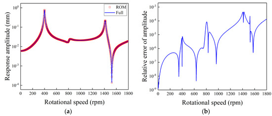 The gravity response amplitude and the relative error of reduced-order model (ROM) versus rotational speed: (a) gravity response amplitude; (b) relative error.