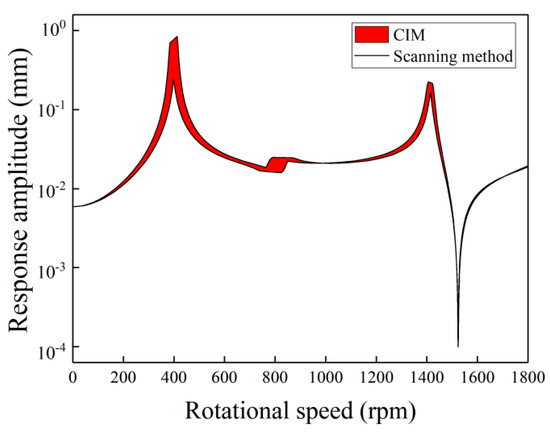 Figure 4 shows the uncertain gravity response amplitude versus the rotational speed by using the scanning method and the proposed method. The uncertain gravity response of the left disk is evaluated. In this figure, the uncertainty in the bearing’s stiffness is considered. The deviation of the bearing’s stiffness is 10%, which means that N/m. As shown in Figure 4, the results (lines) calculated by the scanning method and the results (red-filled) calculated by the proposed method are in good agreement with each other. In the application of the scanning method, 1000 equidistant samples are used. The order of Chebyshev polynomial expansion is 10, so that the number of CIM samples is 11. The samples used in the proposed method are just 1.1% of that used in the scanning method. A conclusion can be made that CIM can give an accurate prediction of an uncertain gravity response of the generator rotor system with fewer samples than the scanning method. A higher order of Chebyshev polynomial expansion can result in larger computational effort. Therefore, in the following analysis, an 11-order CIM is adopted. Under the influence of the uncertainty in the bearing’s stiffness, there is a local large-amplitude band at each resonance peak, which satisfies the phenomenon in the previous studies concerning uncertain problems [24,32]. The local large amplitude occurs when the uncertain factor that affects the resonance speed is taken into account. The resonance speed increases with the increase of the bearing’s stiffness, which contributes to the occurrence of the local large-amplitude bands in Figure 4.