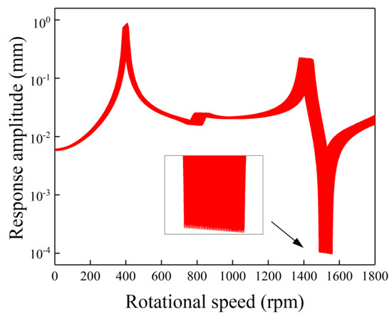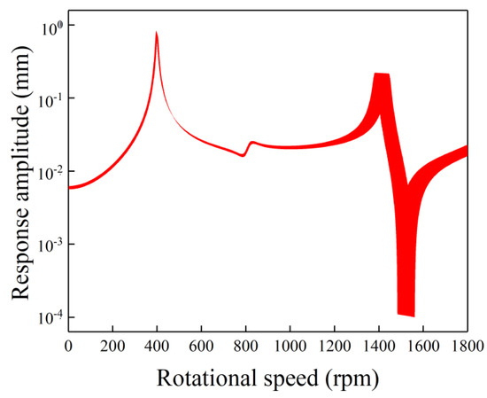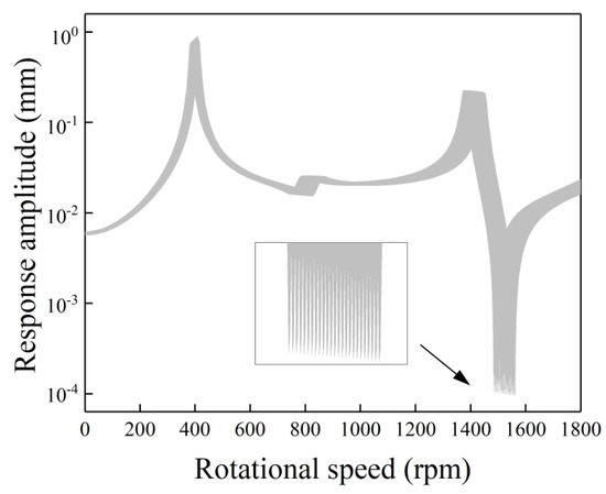 Figure 6 shows the uncertain gravity response amplitudes versus rotational speed with single uncertainty in Young’s modulus. Two local large-amplitude bands can be found in the first and the third resonance peaks. The width of the latter is larger than that of the former. Unlike the above-analyzed single-uncertainty cases, an obvious little-amplitude band can be found at the antiresonance position (near 1500 rpm), which shows the high sensitivity of the antiresonance position on the Young’s modulus. Besides, the response at a higher rotational speed in Figure 6 is more influenced by the Young’s modulus. The origin of this phenomenon is the resonance speed increasing with the increase of the global stiffness of the asymmetric rotor system. The global stiffness is the combination of the stiffness of the rotor and the bearing’s stiffness. As the two stiffnesses can be regarded as in series with each other, the global stiffness is more influenced by the smaller stiffness. Thus, the bearing’s stiffness can globally influence the response curve (Figure 4), while the Young’s modulus has a larger influence on the response curve near 1500 rpm (Figure 5). This is different from Figure 5, where the response at lower rotational speed is more sensitive to the bearing’s stiffness.