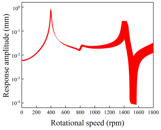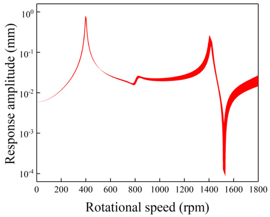 Figure 5 shows the uncertain gravity response amplitudes versus rotational speed with single uncertainty in the bearing’s damping. As shown in Figure 5, although a larger deviation is considered, the response is slightly changed. There is no local large-amplitude band in each resonance peak. This is because the bearing’s damping can only obviously affect the response magnitude near the resonance peak, but it hardly changes the resonance speed. Therefore, tiny bounds near the resonance peaks can be observed while the response amplitudes away from the resonance peak are less influenced. Generally, when compared with the results with single uncertainty in the bearing’s stiffness, the influences of the bearing’s damping on the response are smaller.