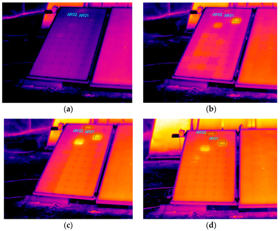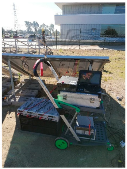 The temperature and thermographic equipment were configured with a recording interval of 1 min, while the weather station was set with a recording interval of 1 s. The values measured in the different DC ammeters, as well as the electronic load voltage, were recorded every 5 min.