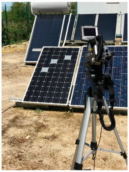 To evaluate the front side temperature of the PV module, a FLIR ThermaCAM S60 was used. As shown in Figure 3, it was placed on an angle that avoided the solar reflection during the test. According to the IEC 62446-3 [21], the thermographic inspection was carried out under an irradiance higher than 700 W/m2, low wind speeds, and an absence of cloudiness. Furthermore, in order to set an accurate camera configuration to reduce measurement errors, the emissivity and the apparent reflected temperature were evaluated as shown in [13]. In accordance with this, the IR camera was placed at an angle slightly greater than 0° in order to avoid self-reflection and less than 40° from the perpendicular line so that the emissivity could be considered constant.