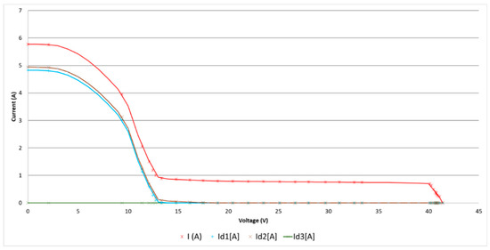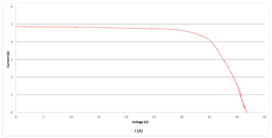 Figure 5 shows the solar PV module I–V characteristic curve in condition 2 with an average irradiance of 946 W/m2. No bypass diode was turned on when the systems worked in a voltage range between 26 and 41 V, while the total output current was considerably reduced in comparison with the current in MPP in Figure 4. To lower voltage operating values than 26 V the current increased to short circuit values, and the substring bypass diode with the covered PV cell started to lead the current, which can be obtained applying the next expression: