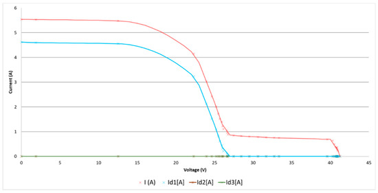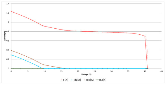 Figure 7 shows the solar PV module I–V characteristic curve in condition 4 with an average irradiance of 1047 W/m2. In this condition, the short circuit PV module measured current is far lower than in Figure 4. Furthermore, in a big part of the characteristic I–V curve, no bypass diode was turned on since all the failures made in each PV cell of different sub-modules were similar. However, there were two bypass diodes turned on when the operation voltage value was below 15 V. This could have been produced due to the sensibility of the different PV cells exposed to failure or mismatching between the photovoltaic current produced by each one of them.