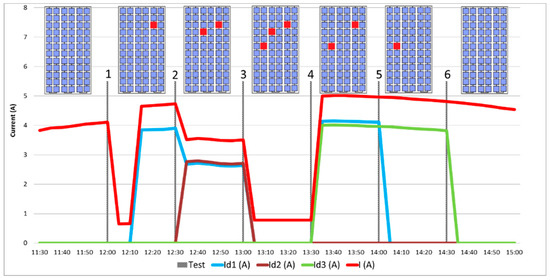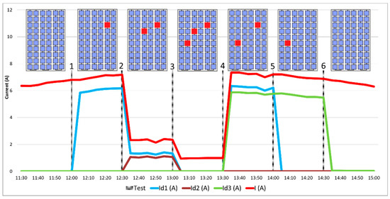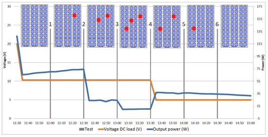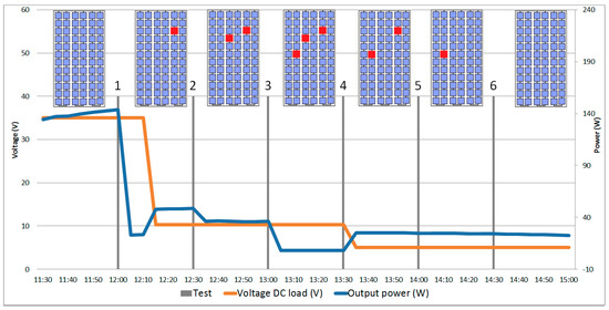 Figure 8 shows the electrical results obtained in test 2. On top of Figure 8, the covered cell in each step has been represented, showing the results below each one. Depending on the covered PV cell and the voltage output of the PV module established, the bypass diode currents and total output current are shown. The test is carried out in the absence of cloudiness and with an irradiance interval between 798 W/m2 and 970 W/m2. Figure 9 shows the output voltage point set by the programmable electric DC load in each step of test 2. If any cell is covered and if the output voltage is close to the MPP of the module, the output current will be much lower than the MPP current, and no bypass diode will carry an electrical current. However, when the output voltage point set is changed to certain lower levels, the total output current increases, while the bypass diode starts to carry an electrical current. In this case, the number of bypass diodes turned on will depend on sub-modules with an affected PV cell. Something different happened when all sub-modules were affected by a covered PV cell since the total output current was lower than the MPP one and no bypass diode was turned on.