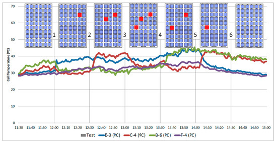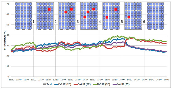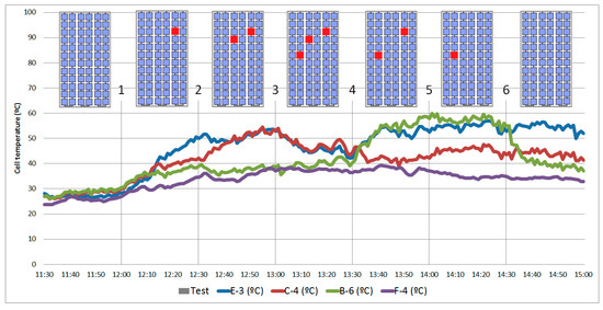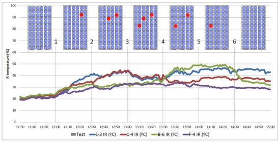 Figure 12 and Figure 13 show the thermal results obtained in test 2. Figure 12 shows the measurements obtained by an IR thermographic camera from the front side of the PV module, while Figure 13 shows the measurements obtained by the thermocouples connected on the back side of the PV module. The evolution of both temperatures through the six steps is similar in both measurements. However, it was noticed that the temperature on the back side is about 10 °C higher than the temperature on the front side. It was possible due to the thermal conductivity of the materials and the different ventilation produced by the wind on each side of the PV module. In steps 1 and 2, the temperature measured in the covered PV cells was higher than the healthy cell, F4, which was not covered. Those temperatures are limited by the bypass diode when turned on. However, the temperature in step 3 was lower than previous steps 1 and 2 and approached that of F4, since each sub-module shared a covered PV cell. Due to having one cell of each sub-module covered, the total output current is low at any voltage, so covered cells convert less energy into heat and become cooler than before.