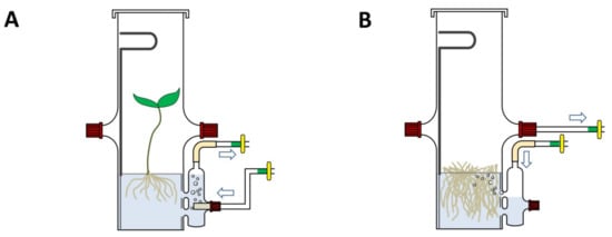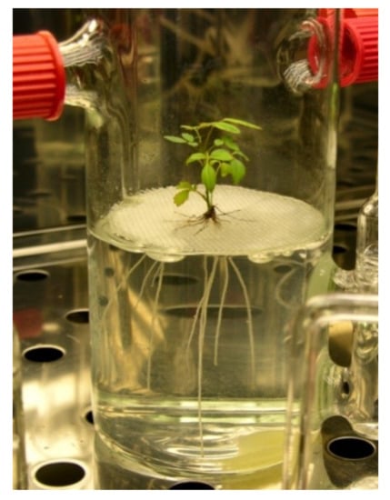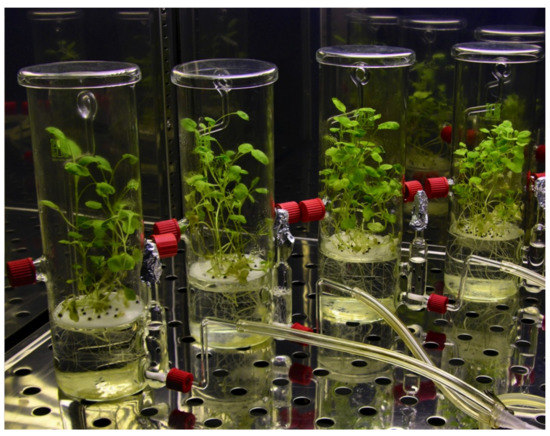 Ten surface-sterilized seeds of a rapid cycling variety of Brassica napus were placed into bioreactors filled with half-concentrated MS medium [60] without sucrose and operated in airlift mode. The plants grown at 24 °C for three weeks have not shown any chloroses or other negative effects of cultivation in restricted space and at high air humidity [62,63] (Figure 3).