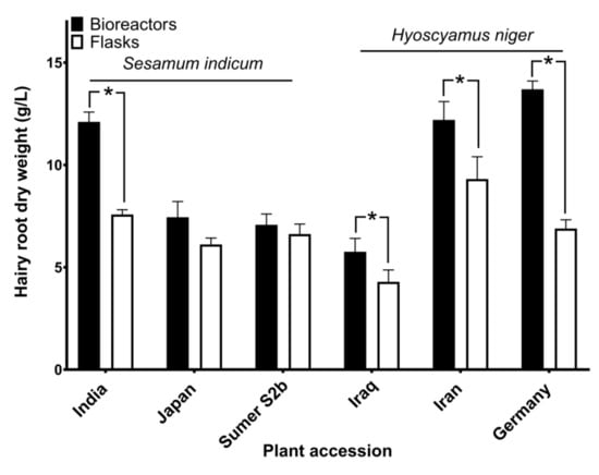 Biomass of hairy roots grown in bioreactors and flask cultures. Hairy root cultures originating from three accessions of each plant species were grown for 30 days and the dry weight of harvested biomass was determined. Asterisks denote significant differences between means (two-tailed t-test, n = 3, p < 0.05).