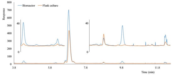 The amount and diversity of hairy root exudates obtained from a bioreactor were higher than the amount and diversity of exudates obtained from a shaking flask culture (Figure 8). Better oxygen supply in the bioreactors was the likely reason. Most importantly, all metabolic signals recorded in exudates from the flask culture were also found in exudates from the bioreactor, indicating that that few (if any) metabolites will be lost by replacing culture flasks with bioreactors.