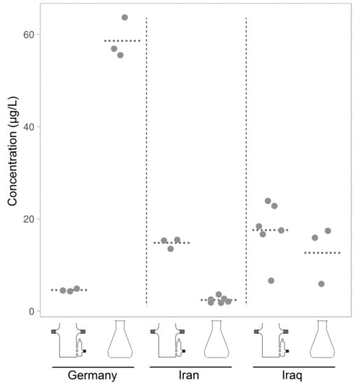 Salicylic acid accumulated in nutrient solution of hairy root cultures derived from three accessions of Hyoscyamus niger (designated Iraq, Iran and Germany) and grown in bioreactors and in shaking flasks for three weeks. Dotted lines show the means.