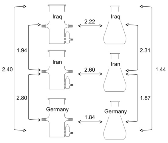 Euclidean distances between normalized metabolic profiles of hairy root exudates obtained from three accessions of Hyoscyamus niger (designated Iraq, Iran and Germany) grown in bioreactors and flask cultures.