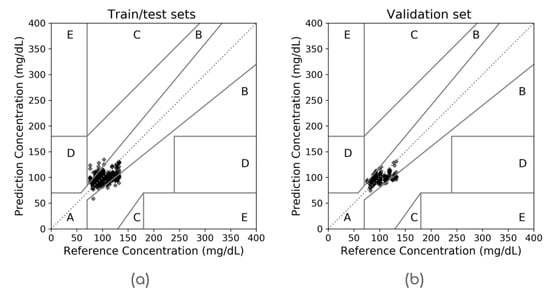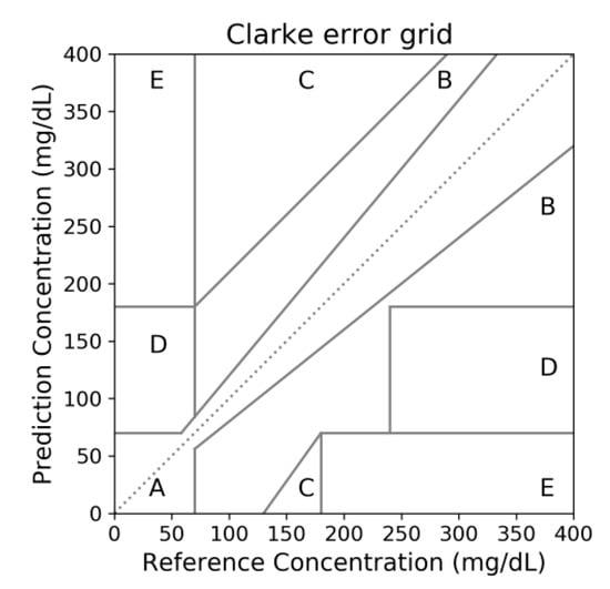 - Evaluation metrics: With the aim to evaluate the model performance, the mean absolute error and the Clarke error grid analysis [46] were adopted. The mean absolute error (MAE) is computed as in Equation (2) where yi represents the reference glucose values, and stands for the estimated values by the algorithm. In the Clarke error grid, the reference glucose concentrations versus the estimated values are plotted and divided into five zones, as shown in Figure 2. Zones A and B represent accurate or acceptable glucose results, respectively; zone C could lead to unnecessary treatments while zones D and E entail potentially dangerous mistreatment.