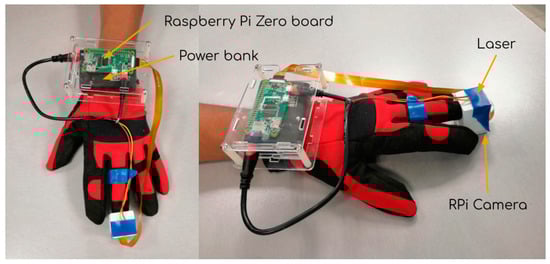 In order to house the system, two cases were used: one, 3D-printed, embedding the laser and the camera used for light condition controlling, and other one for enclosing the RPi, both attached to the glove. This glove represents the main embodiment of the system in order to keep the laser-camera and the Raspberry Pi Zero board altogether.