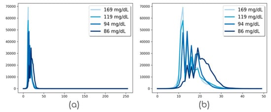 Histograms for images of users with different glucose levels (a) and a closer view (b).