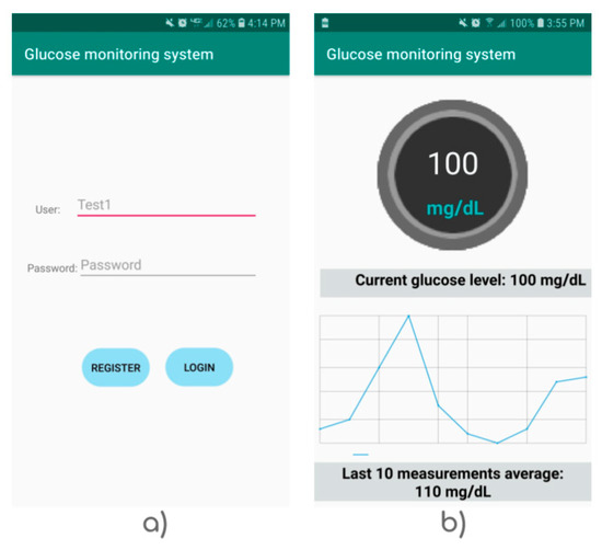 Example of mobile application screens (a) for login and (b) current glucose level.