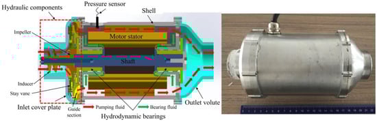 The structure of the high-speed centrifugal pump is illustrated in Figure 1 and it is comprised of rotating and stationary components. Stationary components include inlet and outlet cover plates, a stay vane, guide section, shells, a motor stator, and supporting components. Moreover, rotating components consist of an inducer, an impeller, hydrodynamic bearings, and a shaft. The flow path is formed by the cavity between the rotating and stationary components. The liquid is speeded up and its cavitation is enhanced by the high rotating inducer. After the fluid flows through the impeller, the kinetic energy of the impeller transfers into that of the fluid. In order to reduce the flow loss, the stay vane after the impeller transfers the kinetic energy of the fluid into its pressure energy. Most of the fluid enters the flow path in the motor. After cooling the motor, it is collected by the outlet cover plate. Only a small percentage of the fluid passes through the gap under the stay vane, enters into the gap in the hydrodynamic liquid lubricated bearing and provides the bearing capacity by establishing a liquid film.