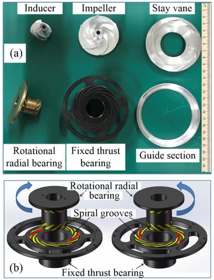 (a) Main hydraulic components of high-speed centrifugal pump. (b) Details of Hydrodynamic Bearings.