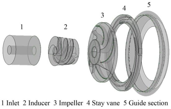 The flow-path shown in Figure 3 is divided into five regions: the inlet, the inducer, the impeller, the stay vane, and the guide section of the high-speed pump. The physical model of the high-speed pump is established by Solidworks 2018. The meshes near the vane surfaces, the flow path wall and the blade tip clearance are specifically refined.