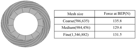 Generally, the radial bearing has sufficient load capacity to balance the weight of the rotor itself. The load capacity from the thrust bearing is more critical for the high-speed operation of a hydrodynamic centrifugal pump. Thus, the thrust bearing needs to be given attention. The mesh of flow path in the thrust bearing and the mesh independence study are shown in Figure 4. The liquid film thickness was about 10–50 μm in the thrust bearing, which was far from the size of the flow path in the pump. Therefore, a separate numerical study is presented on the spiral groove thrust bearing for the evaluation of the load capacity. The non-slip boundary condition was applied. The outlet pressure of the pump was set as the inlet pressure of the bearing. The rotation speed was 7200 rpm.